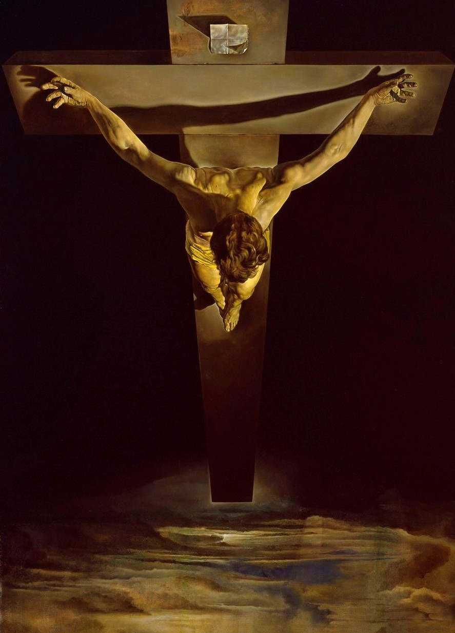 Dalí a visat-o literal: perspectiva de sus, privirea divină, corpul lui Hristos văzut din poziția lui Dumnezeu — de deasupra. Nicio rană vizibilă. Niciun cui în palme. Nicio coroană de spini. Un corp perfect suspendat deasupra unui golf catalan cu bărci de pescari.