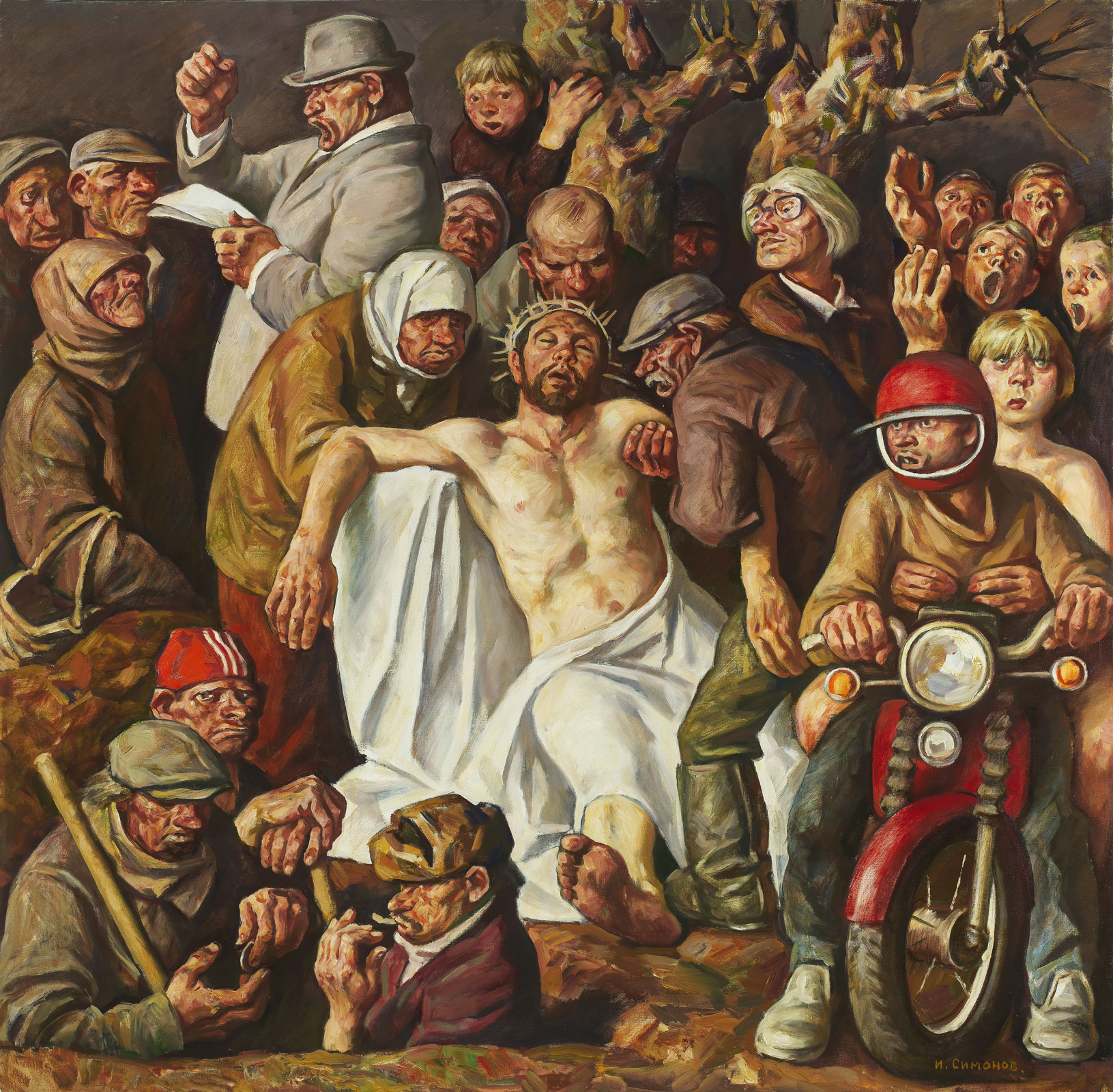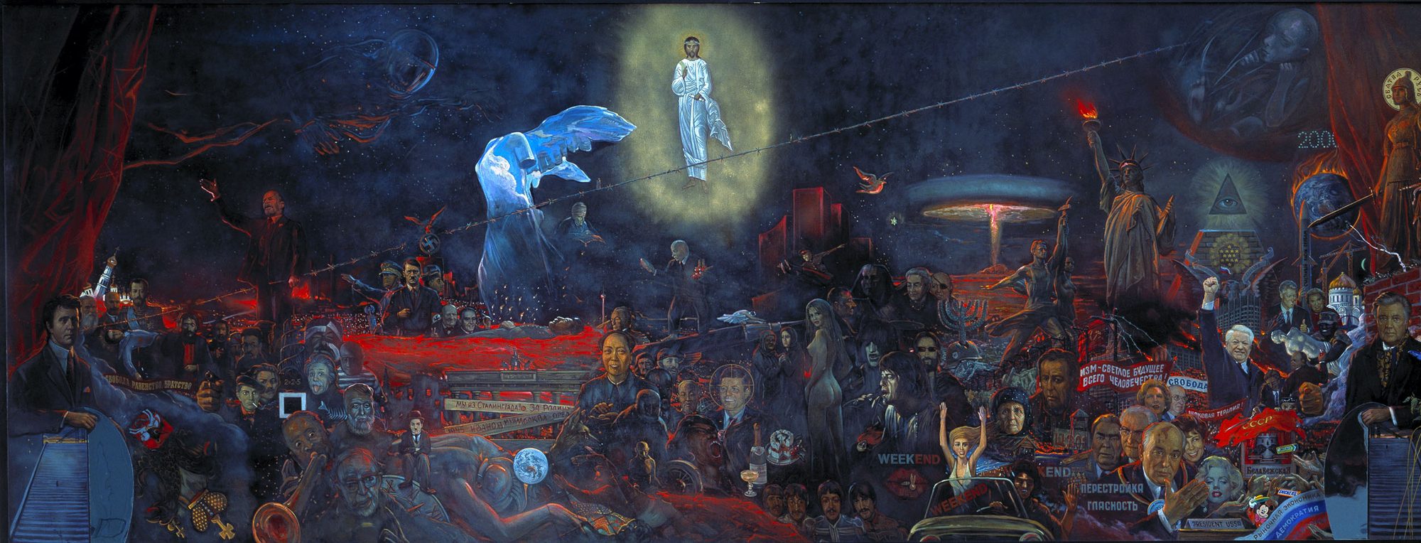 Tabloul e o frescă profană a secolului XX: Lenin cu Troțki, Hitler cu Einstein, Kennedy, Chaplin, Mao, Marilyn Monroe, Soljenițin în haine de pușcăriaș, bomba atomică, Statuia Libertății. Și în centrul absolut, deasupra tuturor — Hristos, privind blând în jos, cu mâna ridicată pentru binecuvântare.